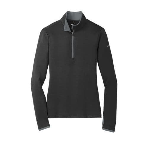 Nike Women's Dri-FIT Stretch 1/2-Zip Pullover Built for the course, gym or just around town, this cover-up performs with comfortable stretch for uninhibited movement and Dri-FIT moisture management technology for exceptional cooling. The design includes a contrast collar and zipper, open cuffs and an open hem. Tailored for a feminine fit. The contrast Swoosh design trademark is embroidered on the upper left sleeve.Thumbholes at cuffs for warmth and enhanced fit. Made of 7.6-ounce, 93/7 polyester/spandex Dri-FIT fabric.