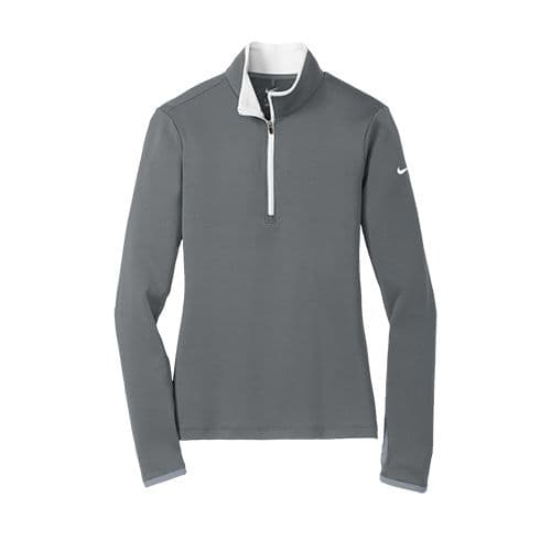 Nike Women's Dri-FIT Stretch 1/2-Zip Pullover Built for the course, gym or just around town, this cover-up performs with comfortable stretch for uninhibited movement and Dri-FIT moisture management technology for exceptional cooling. The design includes a contrast collar and zipper, open cuffs and an open hem. Tailored for a feminine fit. The contrast Swoosh design trademark is embroidered on the upper left sleeve.Thumbholes at cuffs for warmth and enhanced fit. Made of 7.6-ounce, 93/7 polyester/spandex Dri-FIT fabric.