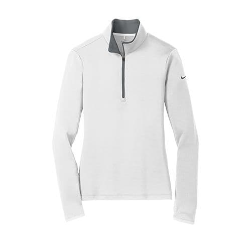 Nike Women's Dri-FIT Stretch 1/2-Zip Pullover Built for the course, gym or just around town, this cover-up performs with comfortable stretch for uninhibited movement and Dri-FIT moisture management technology for exceptional cooling. The design includes a contrast collar and zipper, open cuffs and an open hem. Tailored for a feminine fit. The contrast Swoosh design trademark is embroidered on the upper left sleeve.Thumbholes at cuffs for warmth and enhanced fit. Made of 7.6-ounce, 93/7 polyester/spandex Dri-FIT fabric.