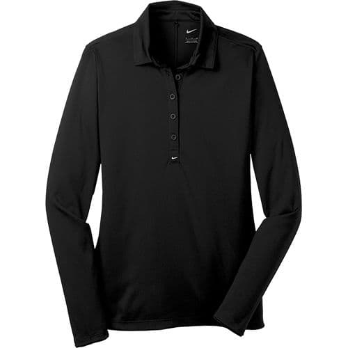 Nike Women's Long Sleeve Dri-FIT Stretch Tech Polo Dri-FIT moisture management technology and stretch fabric make this long sleeve polo a true performer for her. Tailored for a feminine fit with a self-fabric collar, five-button placket and open cuffs. Heat transfer label for tag-free comfort. Dyed-to-match buttons on White and Black. White buttons on Varsity Red, Anthracite and Blue Sapphire. Side vents. The contrast Swoosh design trademark is embroidered on the center front, below the placket. Made of 5-ounce, 100% polyester Dri-FIT fabric.