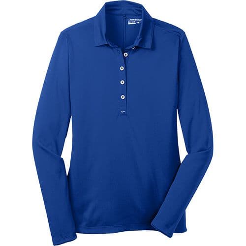 Nike Women's Long Sleeve Dri-FIT Stretch Tech Polo Dri-FIT moisture management technology and stretch fabric make this long sleeve polo a true performer for her. Tailored for a feminine fit with a self-fabric collar, five-button placket and open cuffs. Heat transfer label for tag-free comfort. Dyed-to-match buttons on White and Black. White buttons on Varsity Red, Anthracite and Blue Sapphire. Side vents. The contrast Swoosh design trademark is embroidered on the center front, below the placket. Made of 5-ounce, 100% polyester Dri-FIT fabric.