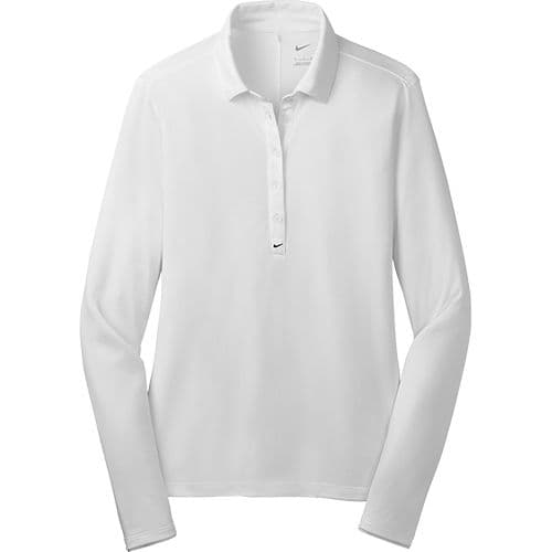 Nike Women's Long Sleeve Dri-FIT Stretch Tech Polo Dri-FIT moisture management technology and stretch fabric make this long sleeve polo a true performer for her. Tailored for a feminine fit with a self-fabric collar, five-button placket and open cuffs. Heat transfer label for tag-free comfort. Dyed-to-match buttons on White and Black. White buttons on Varsity Red, Anthracite and Blue Sapphire. Side vents. The contrast Swoosh design trademark is embroidered on the center front, below the placket. Made of 5-ounce, 100% polyester Dri-FIT fabric.