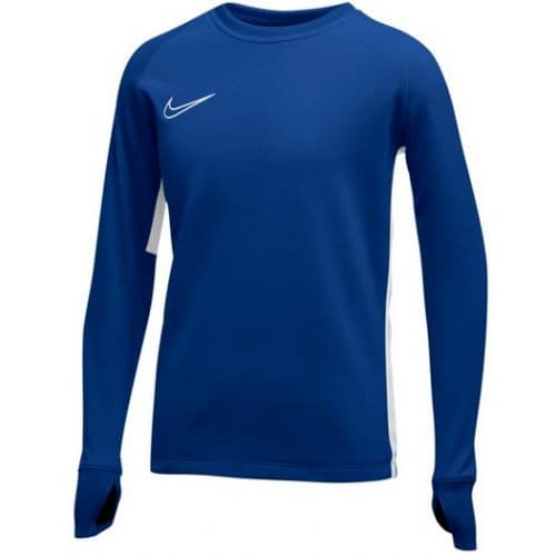 Nike Youth Academy19 Crew Top Dri-FIT technology helps you stay dry, comfortable and focused. Brushed fabric provides a warm, comfortable feel. Mesh side stripes add breathability. Thumb loops help keep your hands covered. Ribbed collar and cuffs help keep warmth in. Outline Swoosh design trademark is embroidered. 100% Polyester.