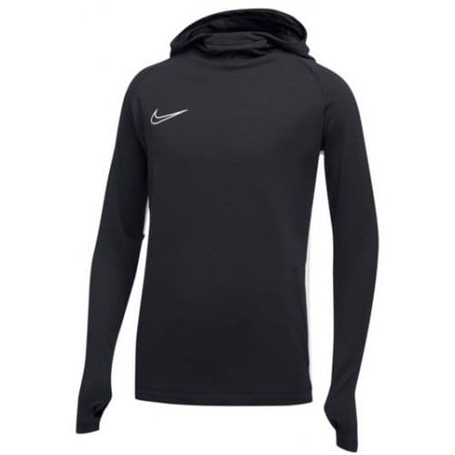 Nike Youth Academy19 Pullover Hoodie Dri-FIT technology helps you stay dry, comfortable and focused. Fitted hood with drawcord provides streamlined coverage. Invisible Thumb Loops stay hidden when not in use. Raglan sleeves eliminate the shoulder seam. Side pockets provide a place to warm your hands. Outline Swoosh design trademark is embroidered. 100% Polyester.