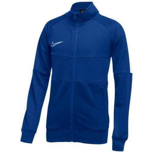 Nike Youth Academy19 Track Jacket Dri-FIT technology helps you stay dry, comfortable and focused. Ribbed cuffs, collar and hem lock in warmth. Full front zipper provides easy on-and-off. Zippered side pockets store your essentials. Outline Swoosh design trademark is embroidered. 100% Polyester.