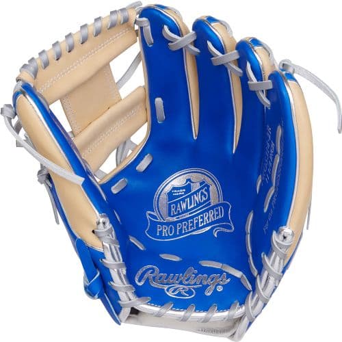 Rawlings 2025 Pro Preferred Series 11.5-Inch Baseball Glove RHT Dominate with the game's best leather and grab this 11.5-inch Pro Preferred infield glove. Crafted with flawless kip leather known for its tight grain and smooth feel, the Pro Preferred lineup is made with Big League quality in mind. That's why hundreds of pros turn to these gloves every season! This infield model features a 31 pattern, which is preferred by infielders who need to make quick transfers from any angle the ball takes them. The Pro-I web helps absorb the impact of any ball while being able to maintain quick transitions for smooth plays all around. Additionally, this glove features royal blue leather that pops with the camel web leather. For some added swagger, this glove sports silver metallic laces and stamping. Rawlings Pro Preferred gloves represent the gold standard in premium baseball gloves, and you can feel the difference when you put one on. See why the game's best turns to this Pro Preferred infield glove on gameday—get yours!