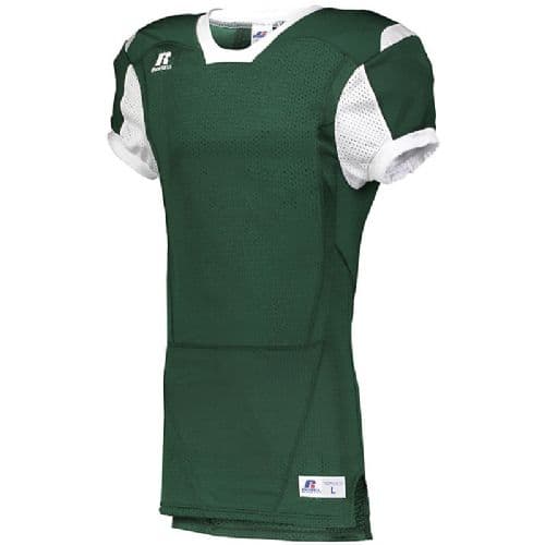 Russell Athletic Color Block Football Jersey Strength and comfort join forces in the Color Block Game Jersey by Russell Athletic. 93 Cloth mesh with a reinforced 73 Cloth yoke offer breathability and durability. This football jersey's unique neck is designed for style and extra ventilation. 100% nylon (colors), 100% polyester (white) tricot mesh. Reinforced 73 cloth yoke for added durability in contact area. Skill cut 73 cloth sleeves for complete pad coverage. Outside locker label. V-neck collar. Contrast color inserts. Set-in sleeves. Dropped tail hem and side vents.