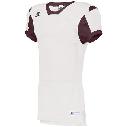 Russell Athletic Color Block Football Jersey Strength and comfort join forces in the Color Block Game Jersey by Russell Athletic. 93 Cloth mesh with a reinforced 73 Cloth yoke offer breathability and durability. This football jersey's unique neck is designed for style and extra ventilation. 100% nylon (colors), 100% polyester (white) tricot mesh. Reinforced 73 cloth yoke for added durability in contact area. Skill cut 73 cloth sleeves for complete pad coverage. Outside locker label. V-neck collar. Contrast color inserts. Set-in sleeves. Dropped tail hem and side vents.