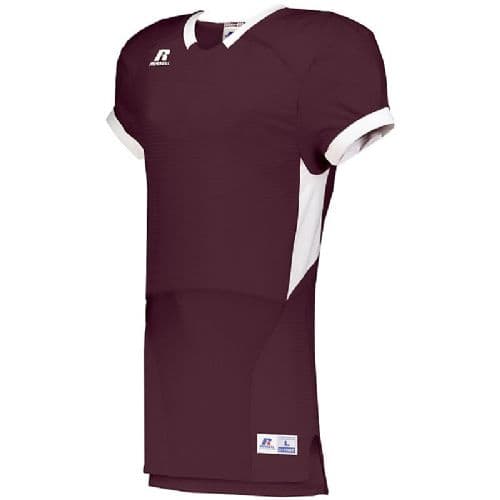 Russell Athletic Color Block Football Jersey Take comfort and durability to the extreme with the Russell Athletic Color Block Game Jersey. Xtreme Compression cloth is full compression, designed to lock in shoulder pads, be tight to the chest and provide maximum mobility. This football jersey boasts 27 front, back and side inserts to provide superior ventilation. 86% nylon/14 % spandex Xtreme compression cloth (colors). 86% polyester/14% spandex Xtreme compression cloth (white). Reinforced XC yoke for added durability in contact area. Z7 front, back and side inserts for superior ventilation. Outside locker label. V-neck collar. Contrast color inserts. Set-in sleeves. Dropped tail hem and side vents.