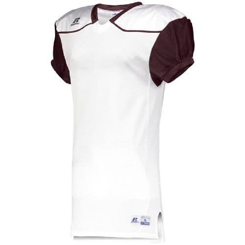 Russell Athletic Football Away Jersey Control the line of scrimmage in this gameday jersey from Russell Athletic. The color block jersey is constructed of 88% Nylon and 12% Spandex and comes in a full length Z7 cloth and features a pro fit. Z7 cloth, 88% nylon/12% spandex, (colors) 88% polyester/12% spandex (white) front, back and side inserts provide superior ventilation. Reinforced 73 cloth yoke for added durability in contact area. 92% nylon/8% spandex (colors), 92% polyester/8% spandex (white). Built in fabric technology helps resist stains and wicks moisture. Wicks moisture. Outside locker label. V-neck collar. Contrast color inserts and piping. Set-in sleeves. Dropped tail hem and side vents.
