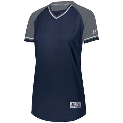 Russell Athletic Ladies' Classic V-Neck Jersey 100% polyester double knit with color secure® technology that helps prevent dye migration. Dri-Power® Moisture Wicking Technology. Ladies' Fit. Tagless label. Outside locker label. V-neck collar with braid trim. Contrast color back yoke, inserts and braid. Raglan sleeves. Contoured bottom.