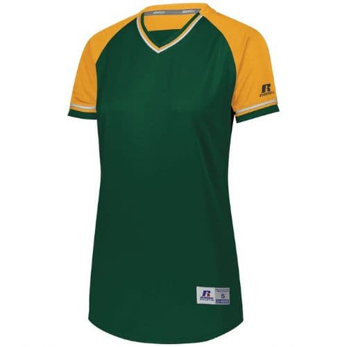 Russell Athletic Ladies' Classic V-Neck Jersey 100% polyester double knit with color secure® technology that helps prevent dye migration. Dri-Power® Moisture Wicking Technology. Ladies' Fit. Tagless label. Outside locker label. V-neck collar with braid trim. Contrast color back yoke, inserts and braid. Raglan sleeves. Contoured bottom.