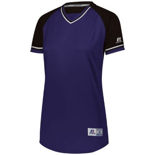 Russell Athletic Ladies' Classic V-Neck Jersey 100% polyester double knit with color secure® technology that helps prevent dye migration. Dri-Power® Moisture Wicking Technology. Ladies' Fit. Tagless label. Outside locker label. V-neck collar with braid trim. Contrast color back yoke, inserts and braid. Raglan sleeves. Contoured bottom.