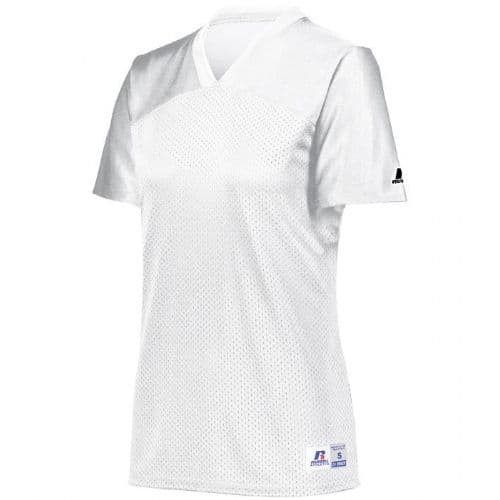 Russell Athletic Ladies' Solid Flag Football Jersey 100% nylon (colors), 100% polyester tricot mesh (white). 73 cloth yoke for added durability in contact area. Ladies' Fit. Outside locker label. V-neck collar. Side vents. Not to be worn with pads. Set-in sleeves.