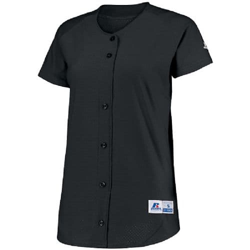 Russell Athletic Ladies' Stretch Faux Button Front Jersey 92% nylon/8% spandex (color). 92% polyester/8% spandex (white). Dri-Power® Moisture Wicking Technology. Ladies' fit. Pad print label. Woven locker label on lower left front. "R RUSSELL" on left sleeve end. Faux full button jersey. Buttons spaced for easy embellishment. Back panel wraps to front with no side seam. Raglan sleeve with modified sleeve length. Fishtail bottom.