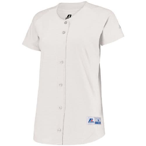 Russell Athletic Ladies' Stretch Faux Button Front Jersey 92% nylon/8% spandex (color). 92% polyester/8% spandex (white). Dri-Power® Moisture Wicking Technology. Ladies' fit. Pad print label. Woven locker label on lower left front. "R RUSSELL" on left sleeve end. Faux full button jersey. Buttons spaced for easy embellishment. Back panel wraps to front with no side seam. Raglan sleeve with modified sleeve length. Fishtail bottom.