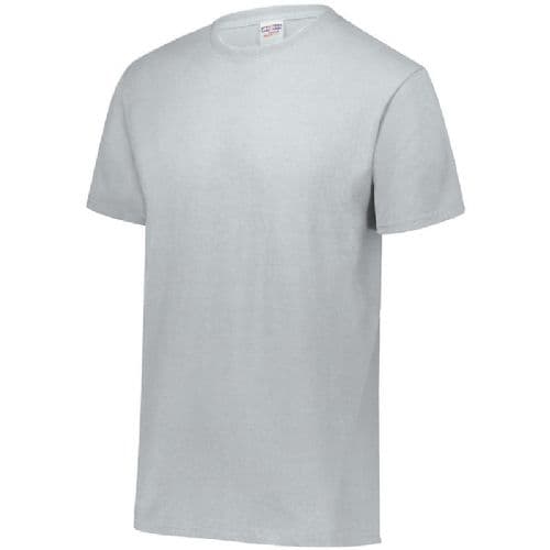 Russell Athletic Men's 50/50 T-Shirt Jerzees Dri-Power® T-Shirt - 5.6 ounce, 50/50 cotton/polyester pre-shrunk jersey Oxford: 47% cotton/53% polyester. Wicks Moisture. Tear away label. Seamless 1X1 rib-knit crew neck collar with two-needle coverstitching on front neck. Shoulder-to-shoulder taping. Quarter-turned to eliminate center crease. Set-in sleeves.