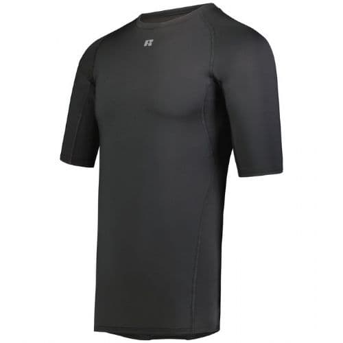 Russell Athletic Men's Coolcore HS Compression Tee 84% polyester/16% elastane Xtreme compression cloth with Coolcore® technology. 92 polyester/8% elastane stretch mesh inserts on center back and underarm. 4-way stretch properties allow for increased mobility. Coolcore® is engineered to distribute moisture quickly throughout the garment. As the moisture spreads it will dry faster and keep you cool and comfortable. Garment protects against the sun with 50+ UPF. Wicks moisture. Tagless label. Crew neck. Raglan sleeves. Dropped tail.