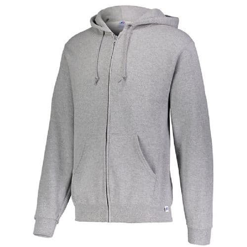 Russell Athletic Men's Fleece Full Zip Hoodie 9.3 ounce. Colors: 50% cotton/50% polyester. Oxford: 52% polyester/48% cotton . Dri-Power® Moisture Wicking Technology. "R" logo flagtag on left hem. Front zipper. Double-ply hood with drawcord. Set-in sleeves. Front pouch pocket. Rib-knit cuffs and bottom band.