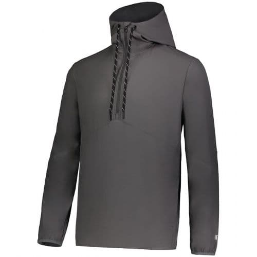 Russell Athletic Men's Legend Hooded Pullover 90% polyester/10% spandex lightweight stretch woven fabric with durable water-repellent finish to keep you dry. 4-Way stretch properties allow for increased mobility. High collar, half-zip pullover style zipper garage. 3-piece hood with drawcord. Set-in sleeves. Side zippered pockets. Inside mesh valuables pocket. Spandex bound cuffs. Open bottom. Water-resistant.