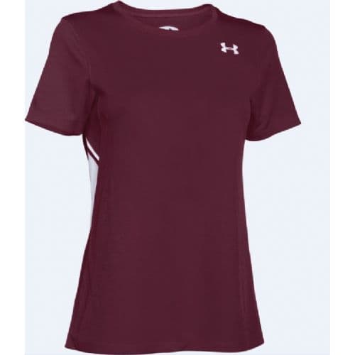 UA Women's Empire Short Sleeve Jersey Soft, super-lightweight HeatGear construction delivers comfort and performance. Color blocked pinhole mesh insets. Comes in a classic short sleeve crew neck or racer back detail. Kilt has an elastic waistband with internal drawcord. Customizable at bottom left hem.