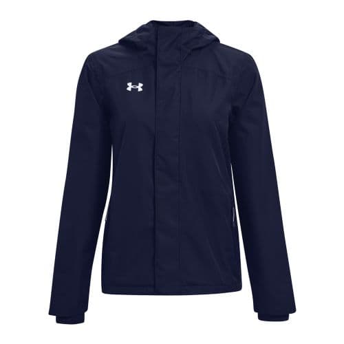 UA Women's Lined Rain Jacket UA Storm technology repels water without sacrificing breathability. 2-Layer outer fabric with fully taped seams is 100% waterproof and windproof. Interior woven lining for added comfort and warmth. Front hood adjust for optimal fit and protection. Secure, zip hand pockets and left chest pocket big enough for a playbook or tablet. ColdGear knit cuffs with built-in thumbholes help keep the cold out. Bungee adjust bottom hem for a secure fit.