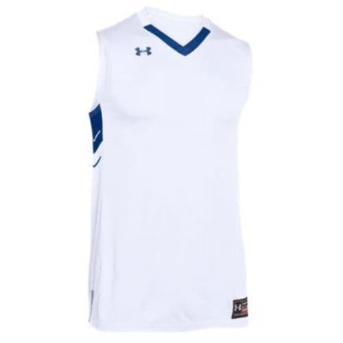 UA Youth Crunch Time Jersey Traditional solid color tank body and short, all 4-way stretch textured HeatGear Polyester. Hemmed armholes and bottom. Aggressive colorblocked neckline. 4" Colorblocked side panel with chevron design. 3" Side vents. Shorts have 2" deluxe Under Armour exposed elastic 4 needle grippy waistband with flat lace drawcord. Inseam: Men's 10", Youth 8".