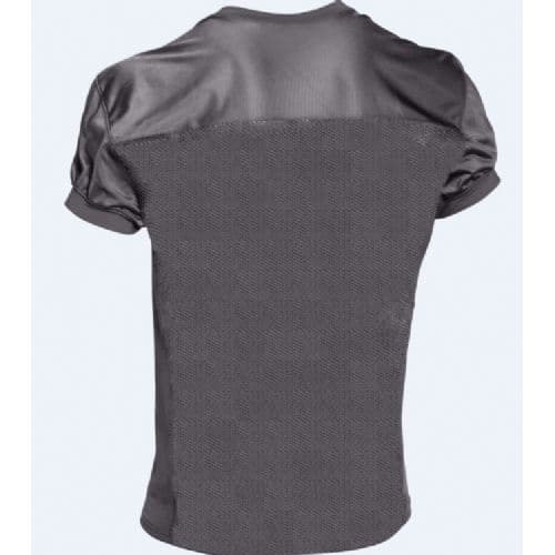Belt length stock football jersey. Durable mini-porthole mesh body with double dry dazzle cowl. Seams are reinforced with cover stitching for durability. Triple bartacked reinforced set-in, mitred V-neck. Lycra knit side inserts, cuffs and color. Jersey is NFHS Compliant.