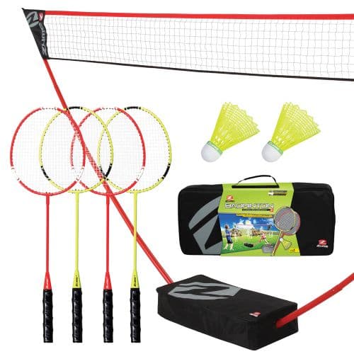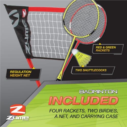 - COMPLETE BADMINTON SET FOR 4 PLAYERS Includes 4 rackets (2 red, 2 green), 2 shuttlecocks, freestanding net, and lightweight carrying caseeverything you need to play.