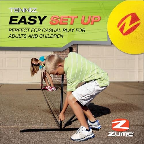 Serve up fun anywhere with the Zume Games Tenniz Portable Tennis Setyour go-to game for outdoor tennis fun on driveways, patios, or in the backyard. This compact set includes a 12-foot net, two 21" lightweight rackets, two soft foam balls, a zippered carrying case, and an easy-to-follow how-to-play guide. Designed for kids, beginners, and families on the move, Tenniz helps players build confidence and coordination with slower-speed foam balls and shorter rackets perfect for learning the game. The entire set assembles in just minutes on any flat surface and stores compactly in the included carry case for easy transport. Whether you're teaching young players or just looking for an easy, space-saving way to enjoy tennis at home, Tenniz is one of the top portable tennis sets loved by parents, coaches, and outdoor game enthusiasts.